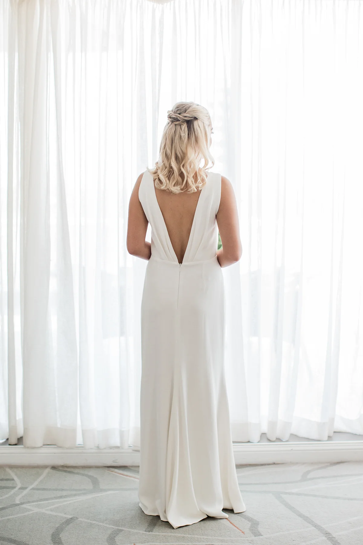 What do you love most about the gown? I love the simplicity in that it isn’t a traditional lace wedding gown. The cut of the wedding dress with the blousy top and low back is so flattering on and it is one of the comfiest dresses I’ve ever worn. The fabric is so soft.